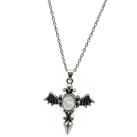 Necklace - Angel Wing Cross - Antique Silver - Rainbow Moonstone