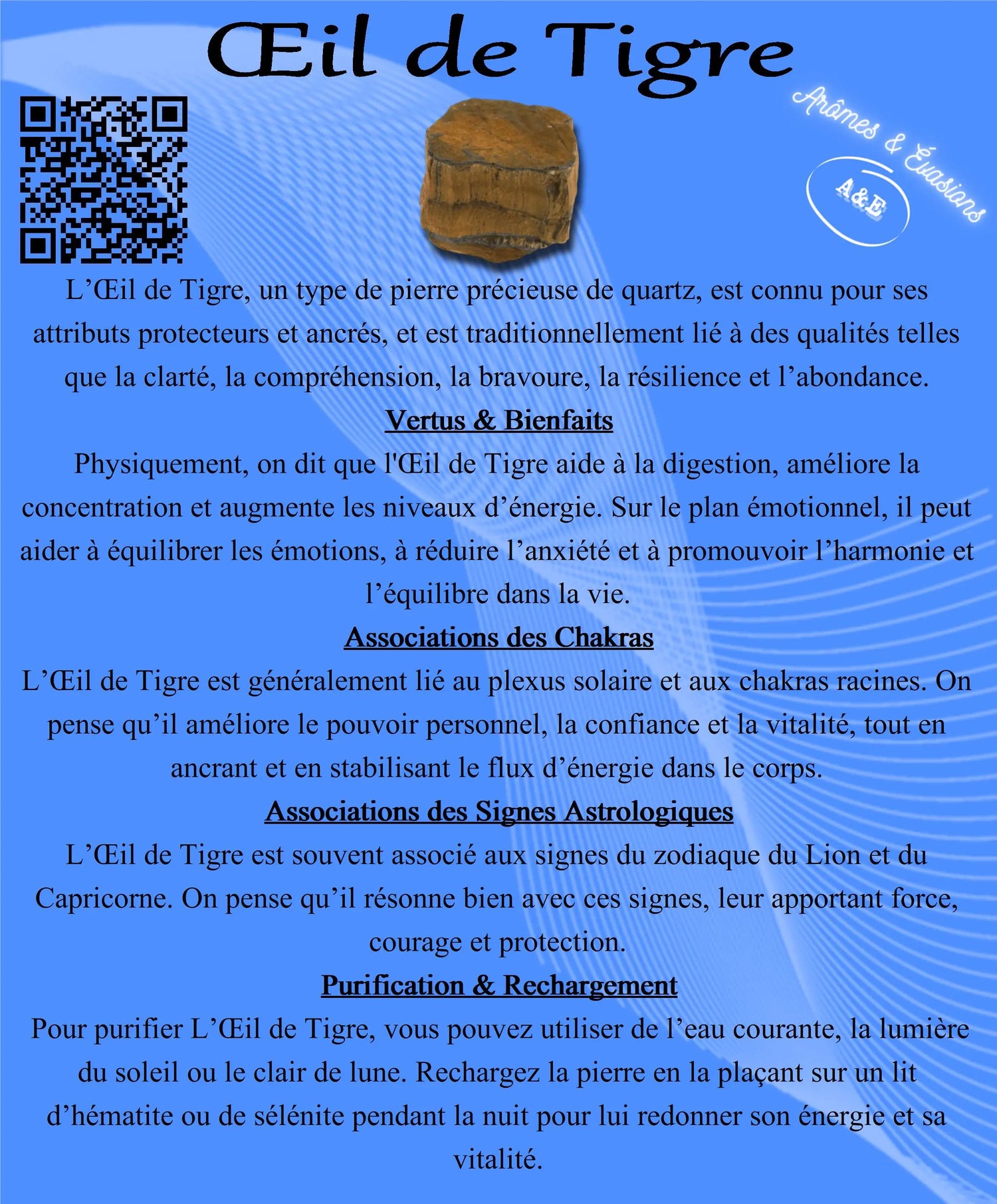 Descriptive card of the virtues and benefits of each gemstone and crystal.