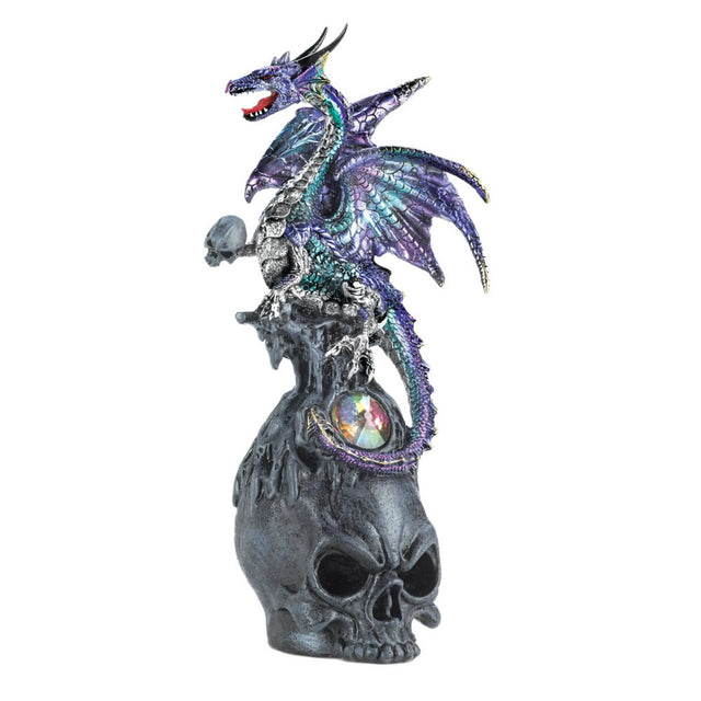 • With a dazzling purple and aqua dragon is perched atop a skull, complete with a brilliant faceted jewel this piece is a must have for any fantasy lover.