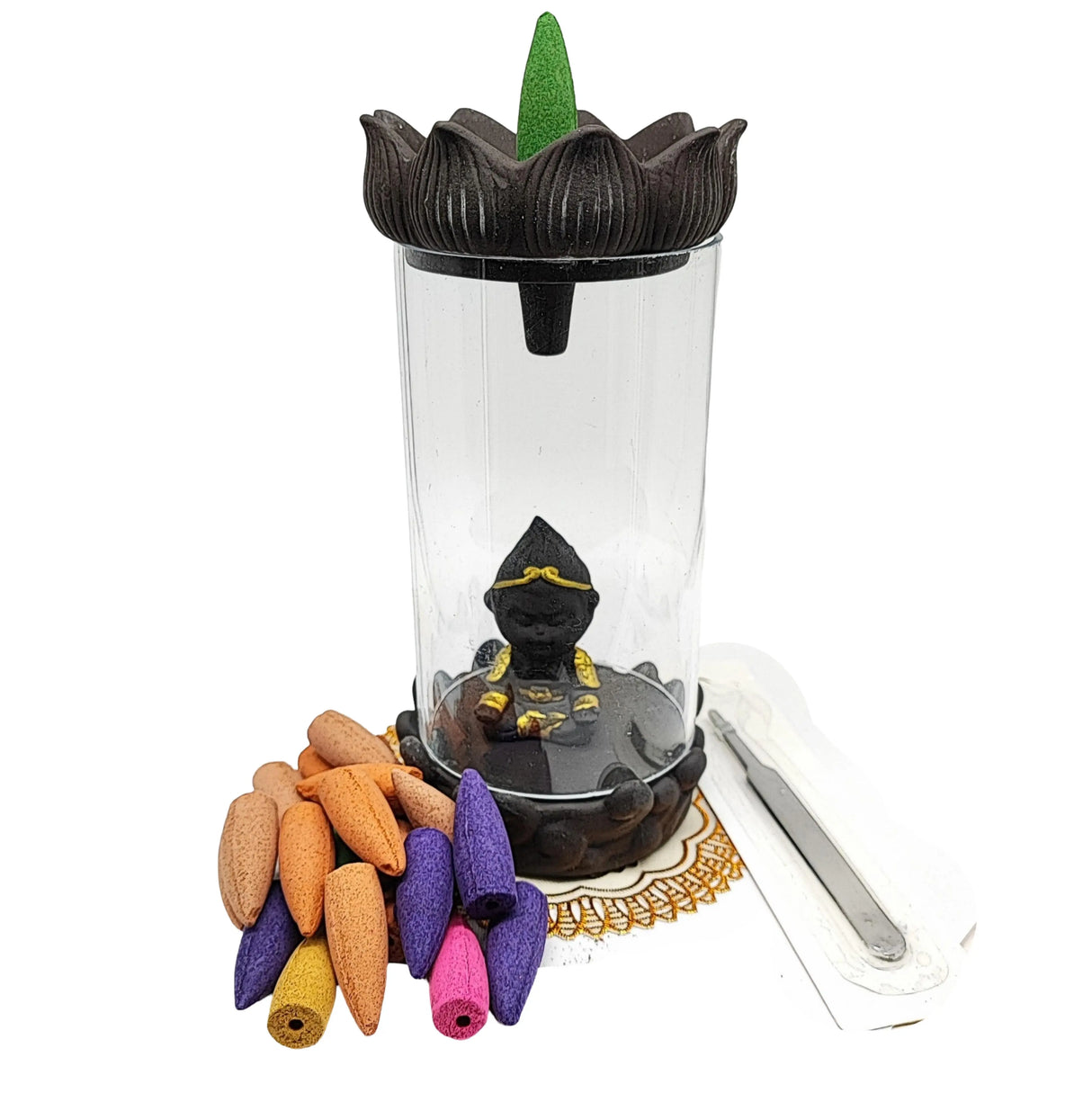 Imbued with the essence of peace, the lotus and Buddha imagery promotes a meditative and soothing space, perfect for enhancing your yoga or meditation practices, or for instilling a calm environment in the home. Witness the enchanting display as the smoke gracefully cascades down, enveloping your space in tranquility.