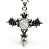 Necklace - Angel Wing Cross - Antique Silver - Rainbow Moonstone