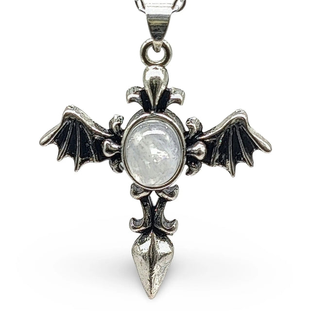 Introducing the "Necklace - Angel Wing Cross - Antique Silver - Rainbow Moonstone"! This stunning piece of jewelry is the perfect way to show off your unique style and add a touch of elegance to any outfit.