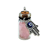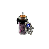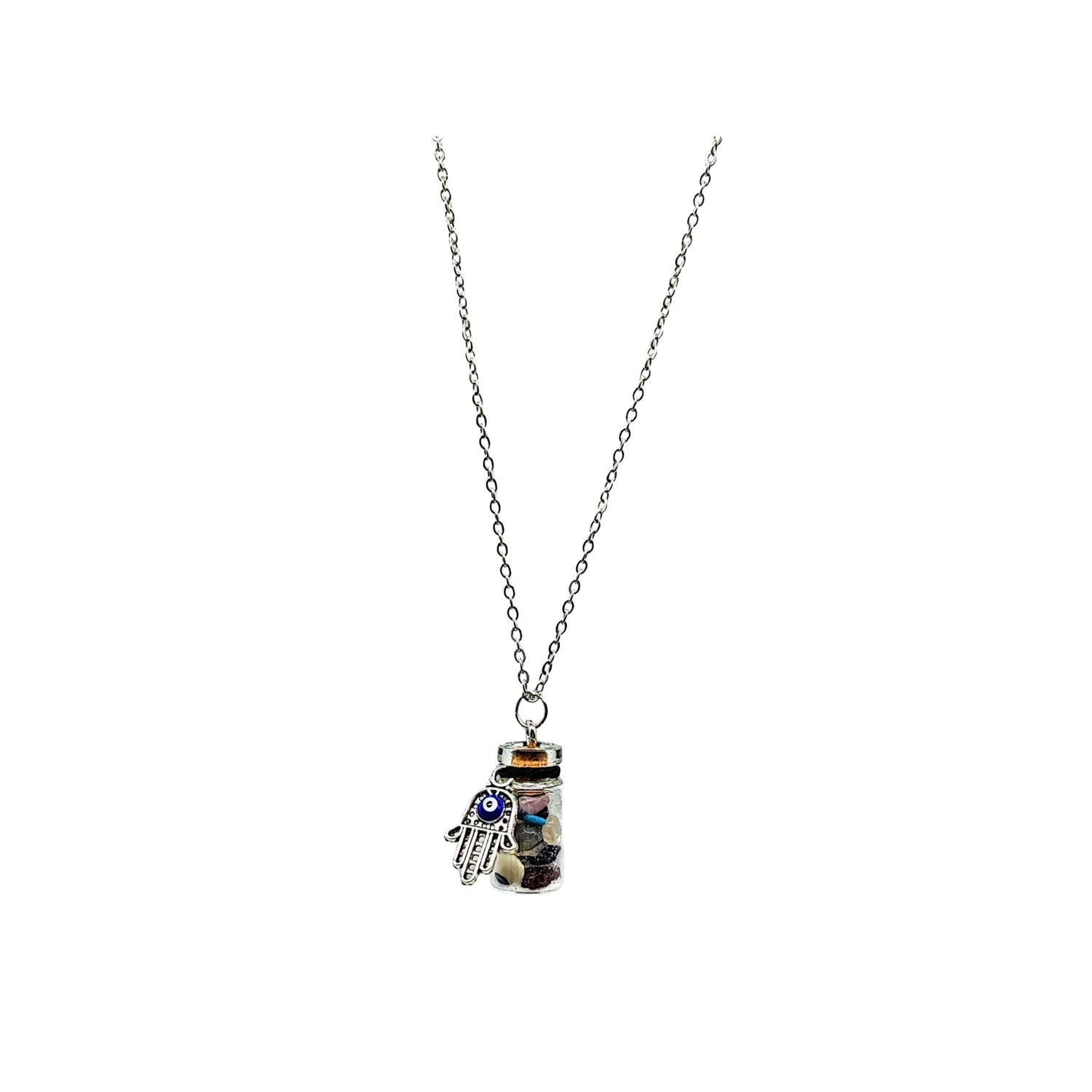 You will love our Glass Bottle Necklace with gemstone chips inside for its originality and its benefits. The bottle is sealed and adorned with a fatima hand charm to give protection against evil forces. You also have the gemstone chips glass bottle, for the virtues & benefits of each gemstone.
