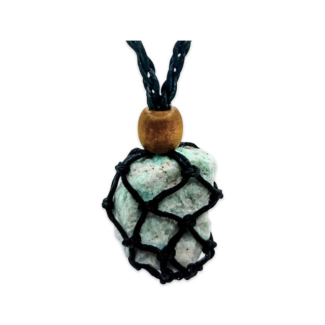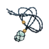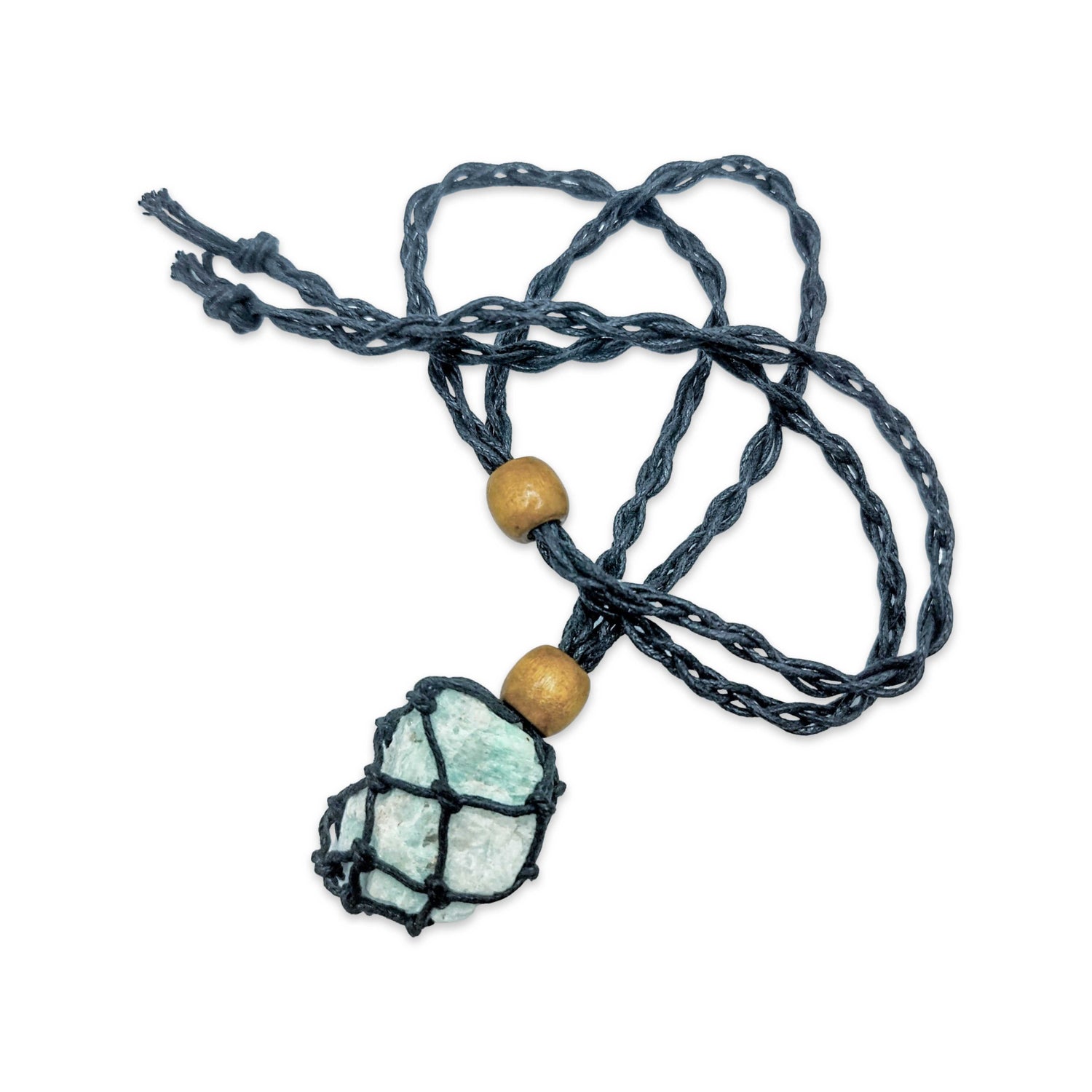 Introducing the Necklace - Mesh Gemstone - Amazonite! This stunning piece features a braided rope pendant in the shape of a braided cage, holding a raw gemstone that will make you stand out from the crowd.