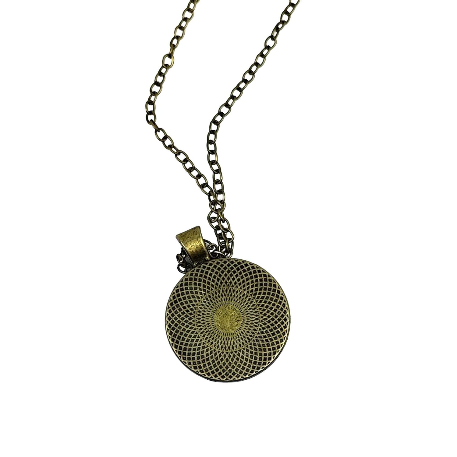 Beautiful bronze necklace with pendant representing OM symbol in front & flower of life in the back.