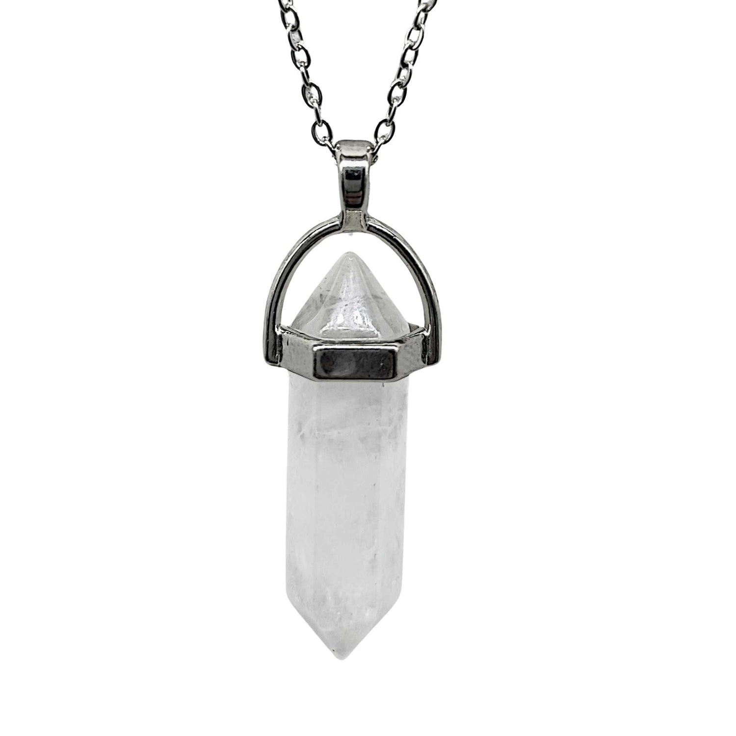 Necklace with a pointed White cristal quartz pendant. Each pendant comes with a leather cord that you can adjusted to your preferred length, or a stainless steal chain.