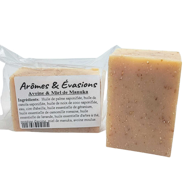 Ingrédients: Saponified Palm Oil, Saponified Canola Oil, Saponified Coconut Oil, Water, Beeswax, Geranium Essential Oil, Roman Chamomile Essential Oil, Lavender Essential Oil, Tea Tree Essential Oil, Protein oats, manuka honey, ground oats.