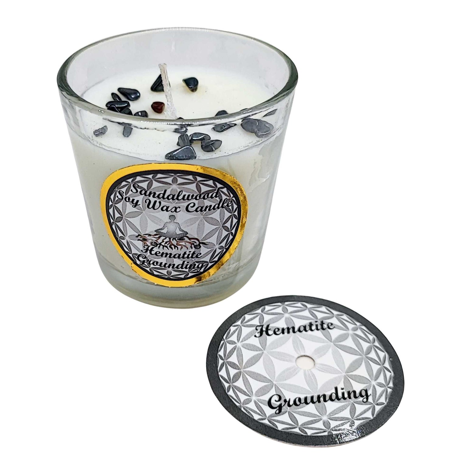 Tags: Harmonia Grounding, Candle, Healing Candle, Sandalwood Oil, Essential Oil, Gemstones, Hematite,