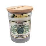 This stunning soy candle is cast in a beautiful 4 inch tall by 3 inch diameter glass with a beautifully etched wooden lid. It will envelop you in its delicate fragrance for 46 hours while enhancing the properties of the stones it contains.