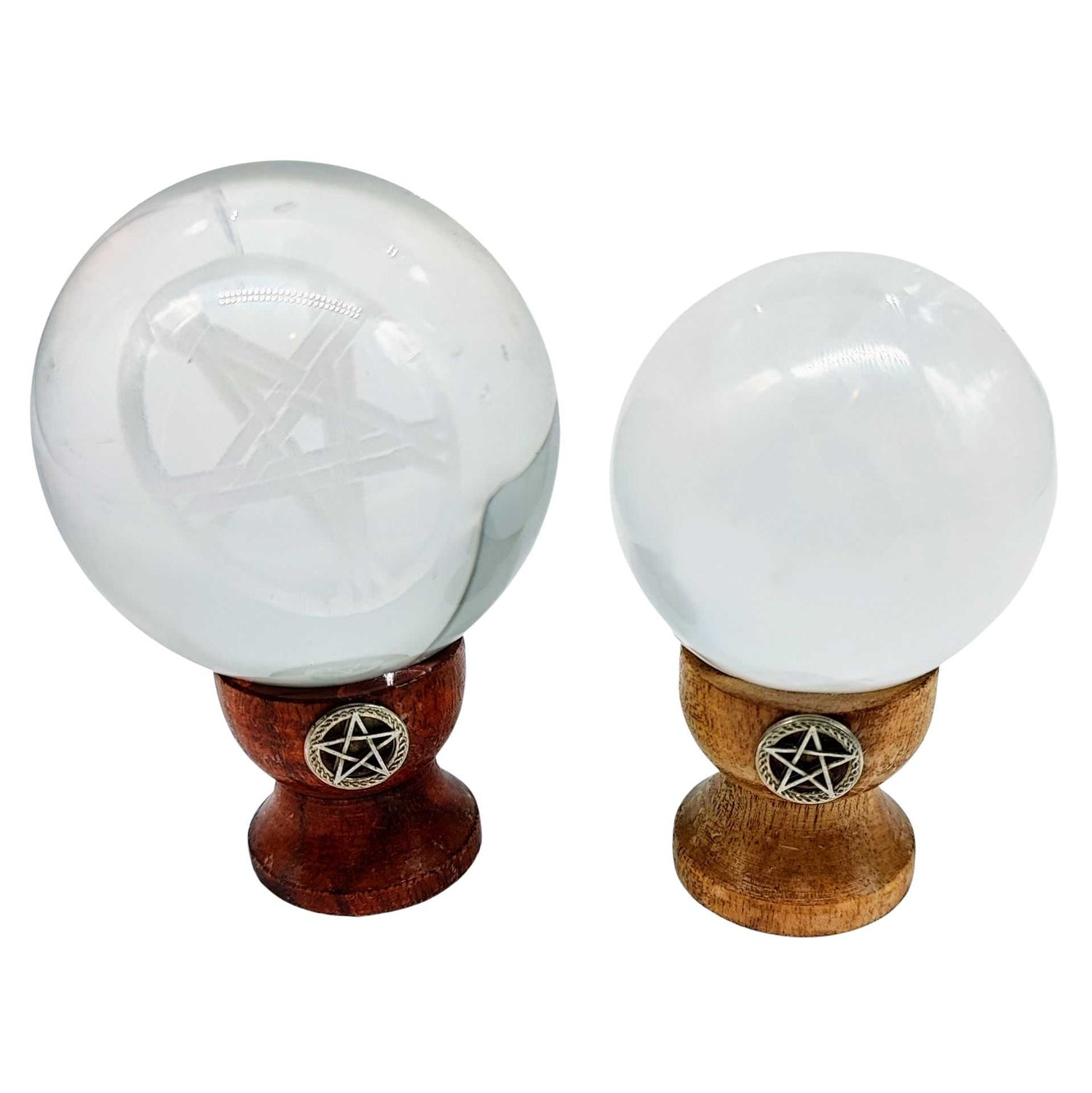 This lovely round wooden sphere holder is perfect for holding small spheres. It showcases a beautiful Pentacle ornament to bring protection, harmony and beauty.