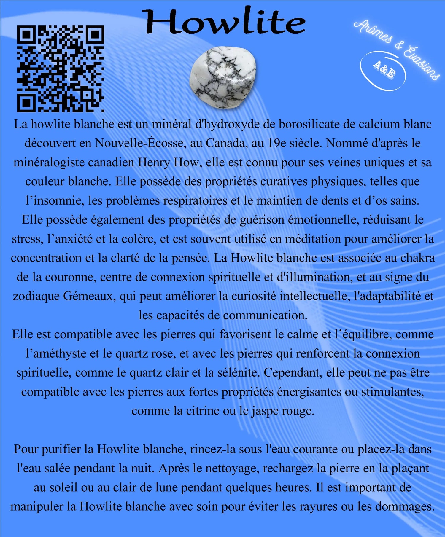 Introducing the Descriptive Cards - Precious Stones & Crystals - Howlite! These bilingual English & French cards are your go-to guide for learning about the virtues and benefits of each gemstone and crystal. Measuring 3.5"X4", these cards are the perfect size for easy reference.