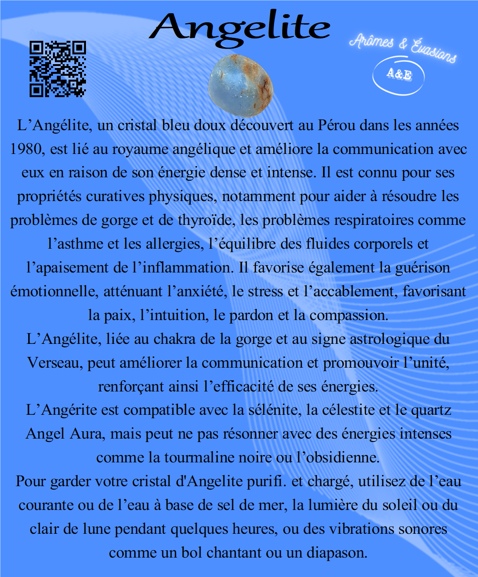 Mots clés : Angélite, Angélite Cartes descriptives, cristaux d'angélite , cristal d'angélite, pierre d'angélite, pierres précieuses d'angélite, signification de l'angélite