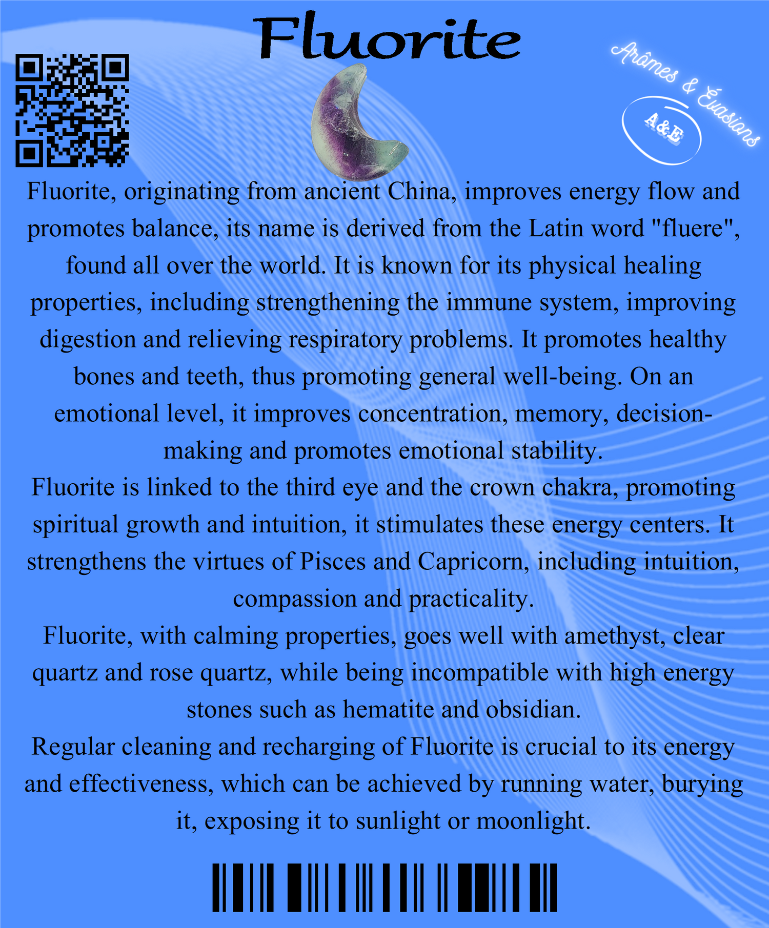 Avec cette carte descriptive en main, vous pourrez exploiter les propriétés curatives de la fluorite chaque fois que vous en aurez besoin. Que vous cherchiez à améliorer votre concentration, à réduire votre stress ou simplement à vous prélasser dans la beauté de ce cristal envoûtant, cette carte est faite pour vous.