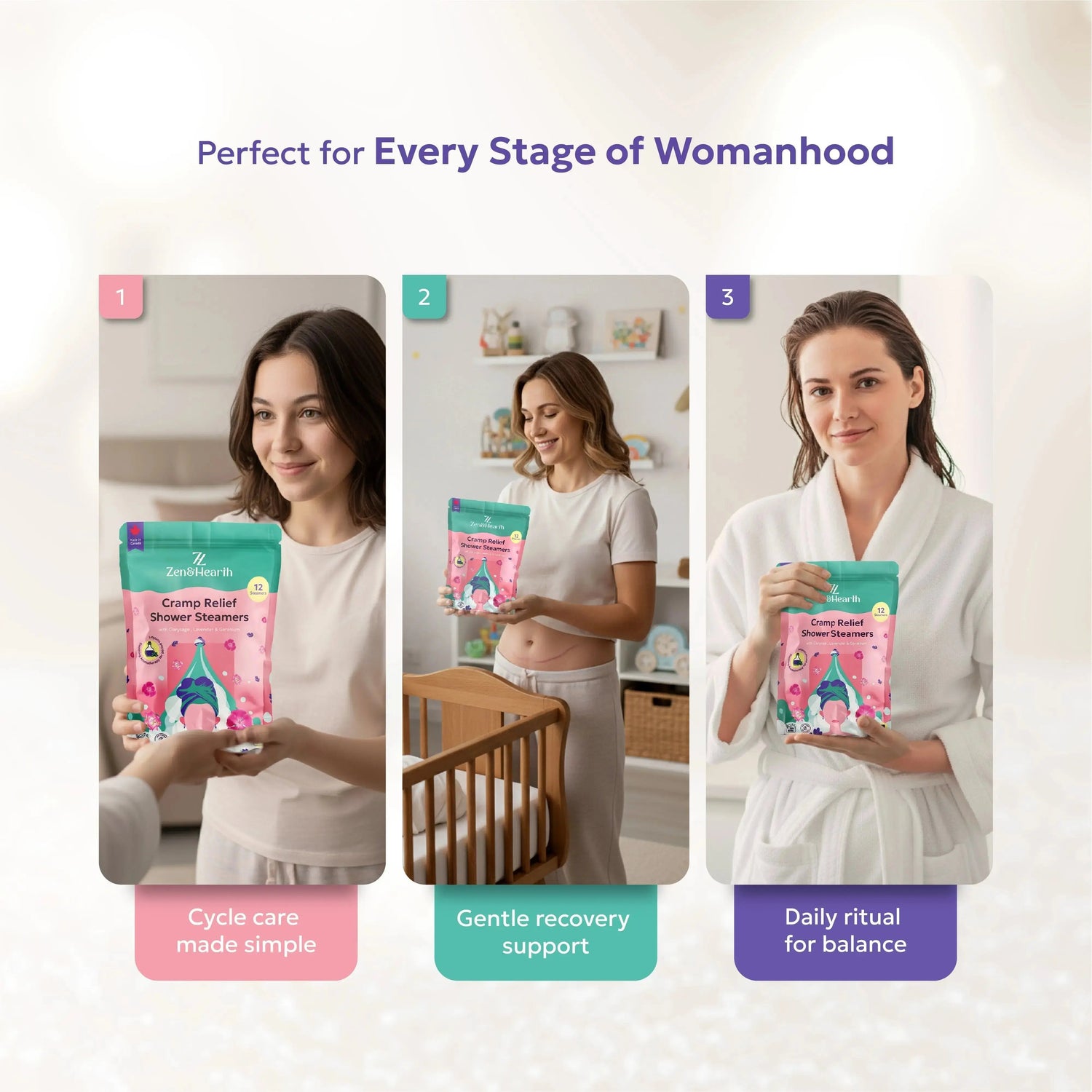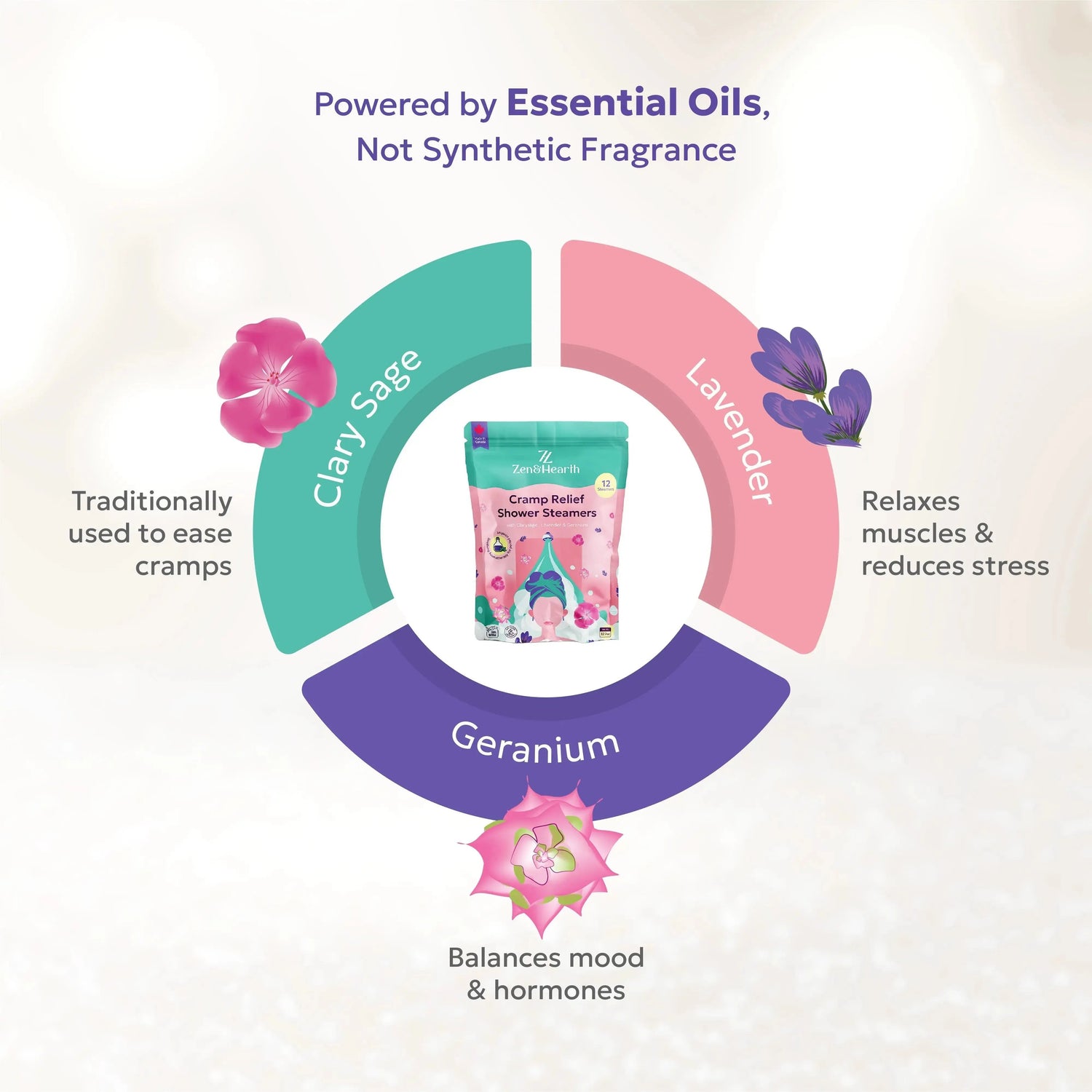 Zen & Hearth Cramp Relief Shower Steamers - Handcrafted Aromatherapy Tablets with Clary Sage, Lavender & Geranium for Period Pain Relief & Relaxation Made in Canada