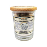 This stunning soy candle is cast in a beautiful 4 inch tall by 3 inch diameter glass with a beautifully etched wooden lid. It will envelop you in its delicate fragrance for 46 hours while enhancing the properties of the stones it contains.